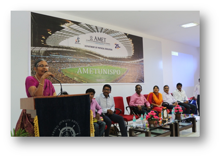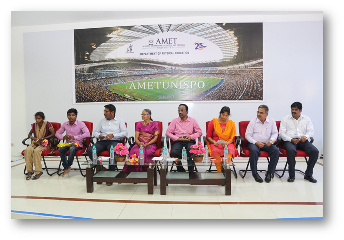 AMETUNISPO 2016-17 (Sports Day) was held at AMET campus on 19th April 2017. The function starts with the Inaugural Address by Mr. Rajesh Ramachandran, Pro-Chancellor, presidential address by Col.Dr.G.Thiruvasagam, Vice Chancellor. The Chief Guest of the day was Mrs. Balambal Balasubramaniam, Asian Athlete, who delivers the Chief Guest address, and the Guest of Honor was Mr. Muthu Kamatchi and MS. Meena, Paralympics Athletes, Represented Tamil Nadu State. The presence of the Chief Guest and the Guest of Honors steals the student’s attention. Dr.A.Saravanan, Registrar give away the prizes for the winners and runners for the Intramural competitions. The program ends with the National anthem.