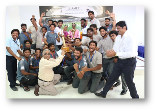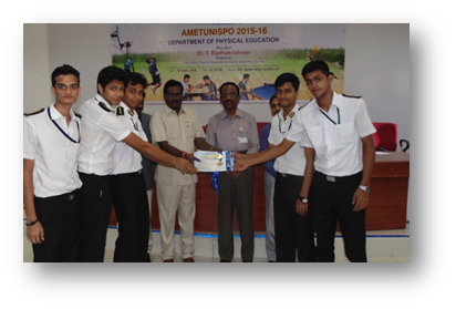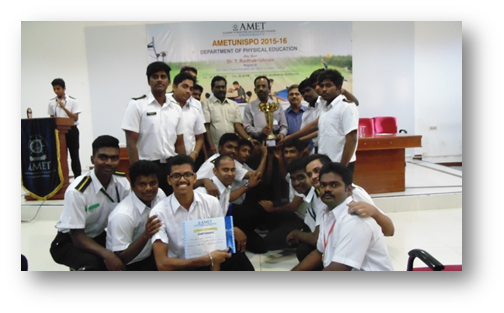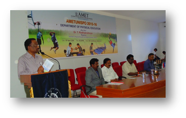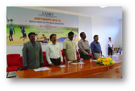 The function AMETUNISPO 2015-16 (Sports Day) was held at AMET campus on 15th March 2016. The function starts with the presidential address by Col.Dr.G.Thiruvasagam Vice Chancellor, AMET, Chennai. The Chief Guest of the day was Dr. T. Radhakrishnan, Registrar, Tamil Nadu Physical Education and Sports University, Chennai, who delivers the Chief Guest address. The presence of the Chief Guest steals the student’s attention. Mr. Karikalan, Senior Vice-President, Dr.A.Saravanan, Registrar give away the prizes for the winners and runners for the Intramural competitions. The program ends with the National anthem.